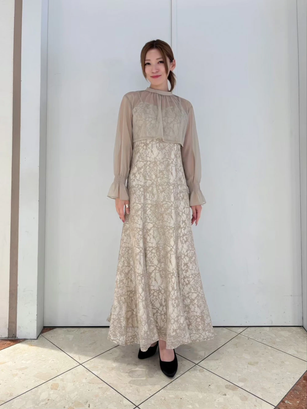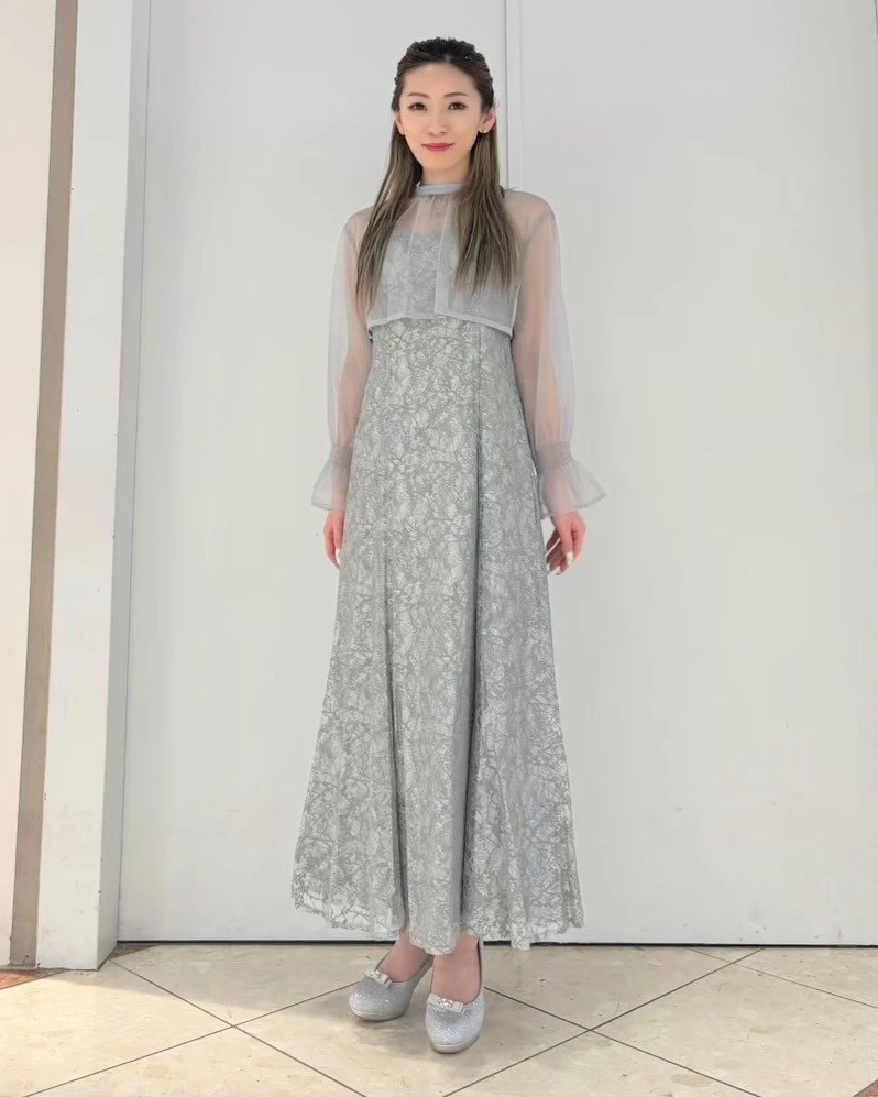 繊細なレースのスカートとシアーなトップスを組み合わせた、上品で女性らしいドレス✨