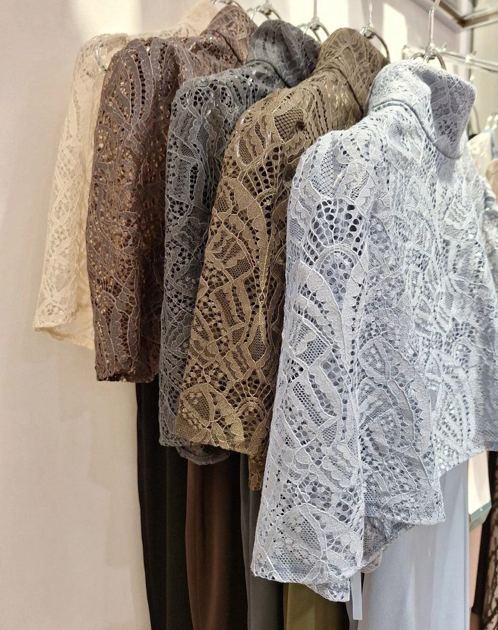ハイネックと半袖レースがエレガントな雰囲気を演出し、マーメイドラインスカートが美しいシルエットを作ります🥰