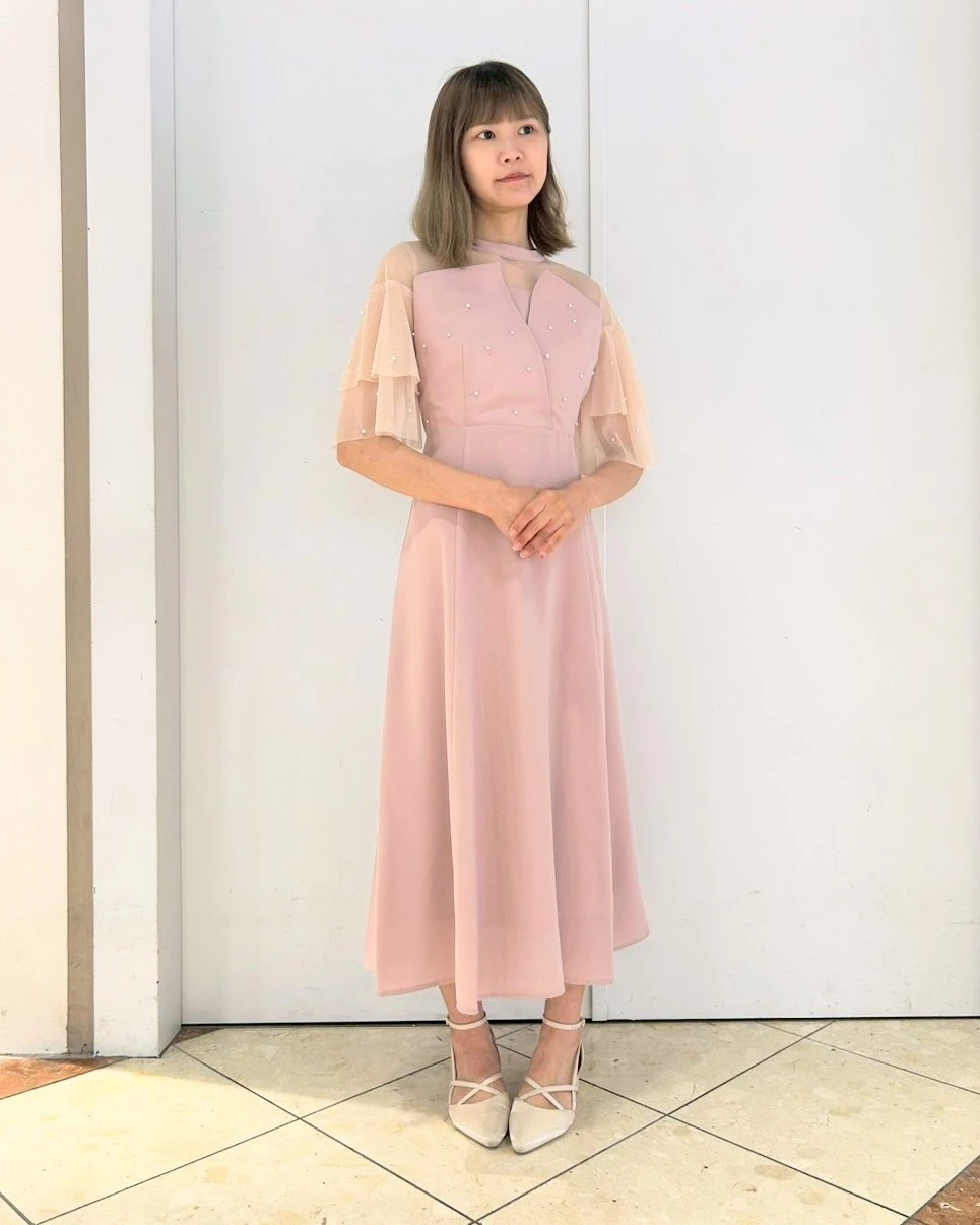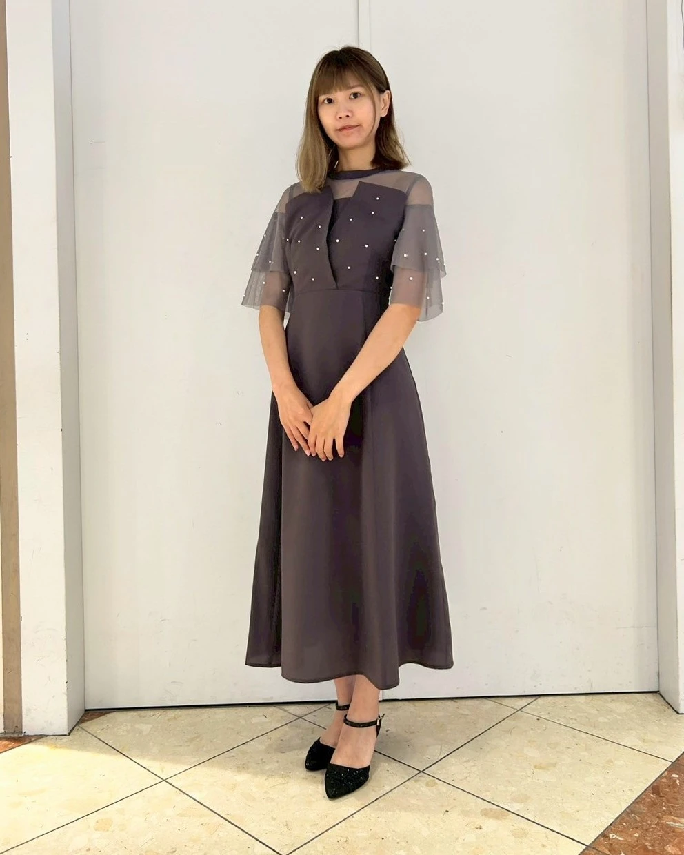 胸元と袖にあしらわれたパールが上品で華やかな印象を与えるドレス🥰