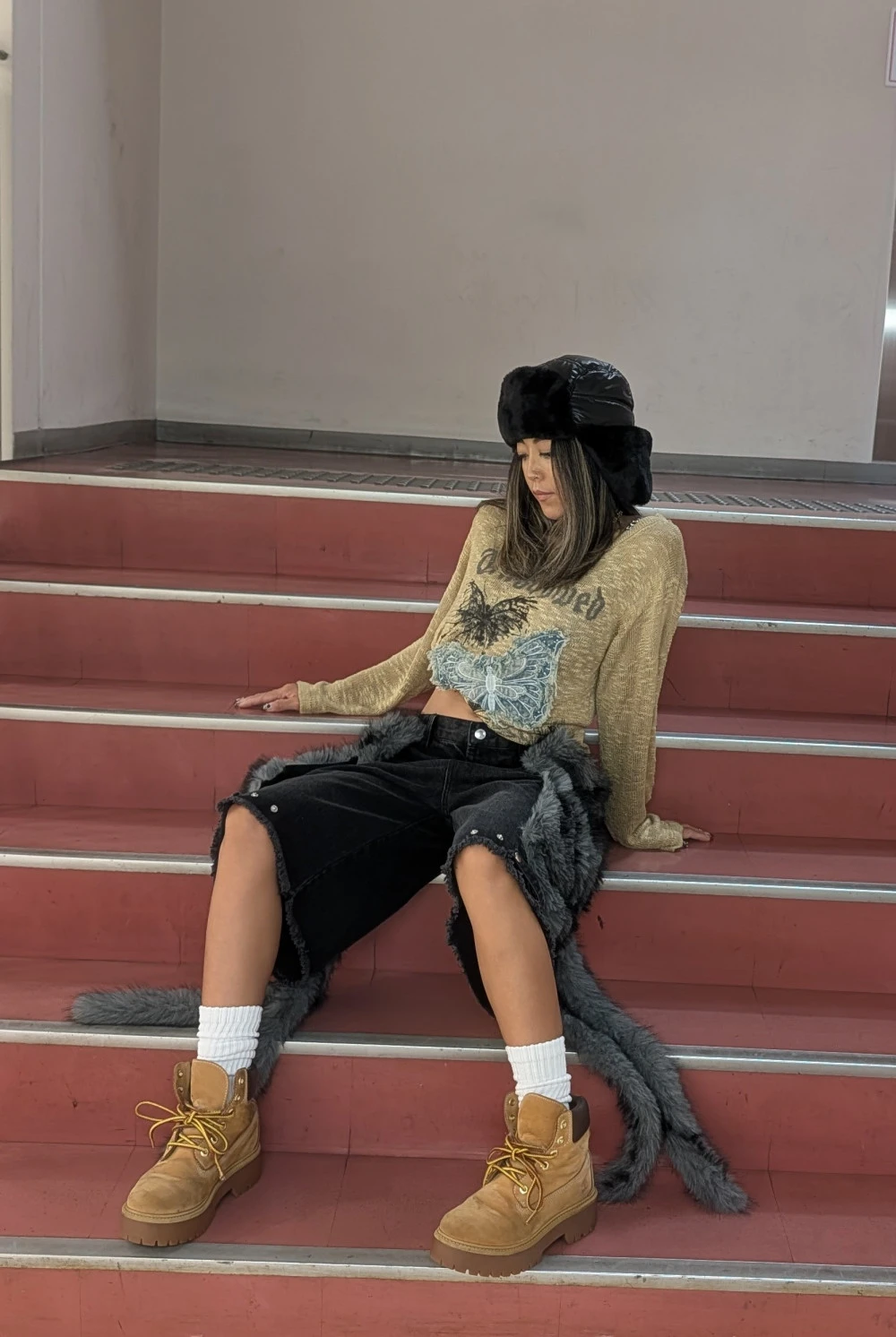 ゆるめのニットトップスで少し抜け感もプラスしながら、黒のファー付きパイロット帽でかっこよく🖤🖤🖤