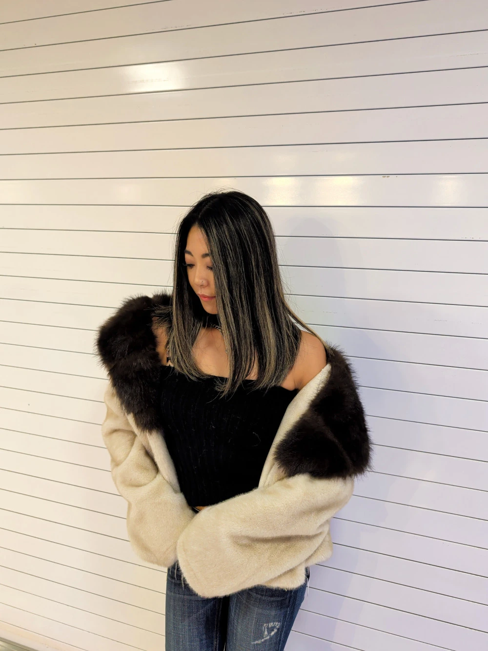 ホワイトのファーアウターは裏地がムートン調で防寒バッチリなので、インナーは露出しましょ😍💕
