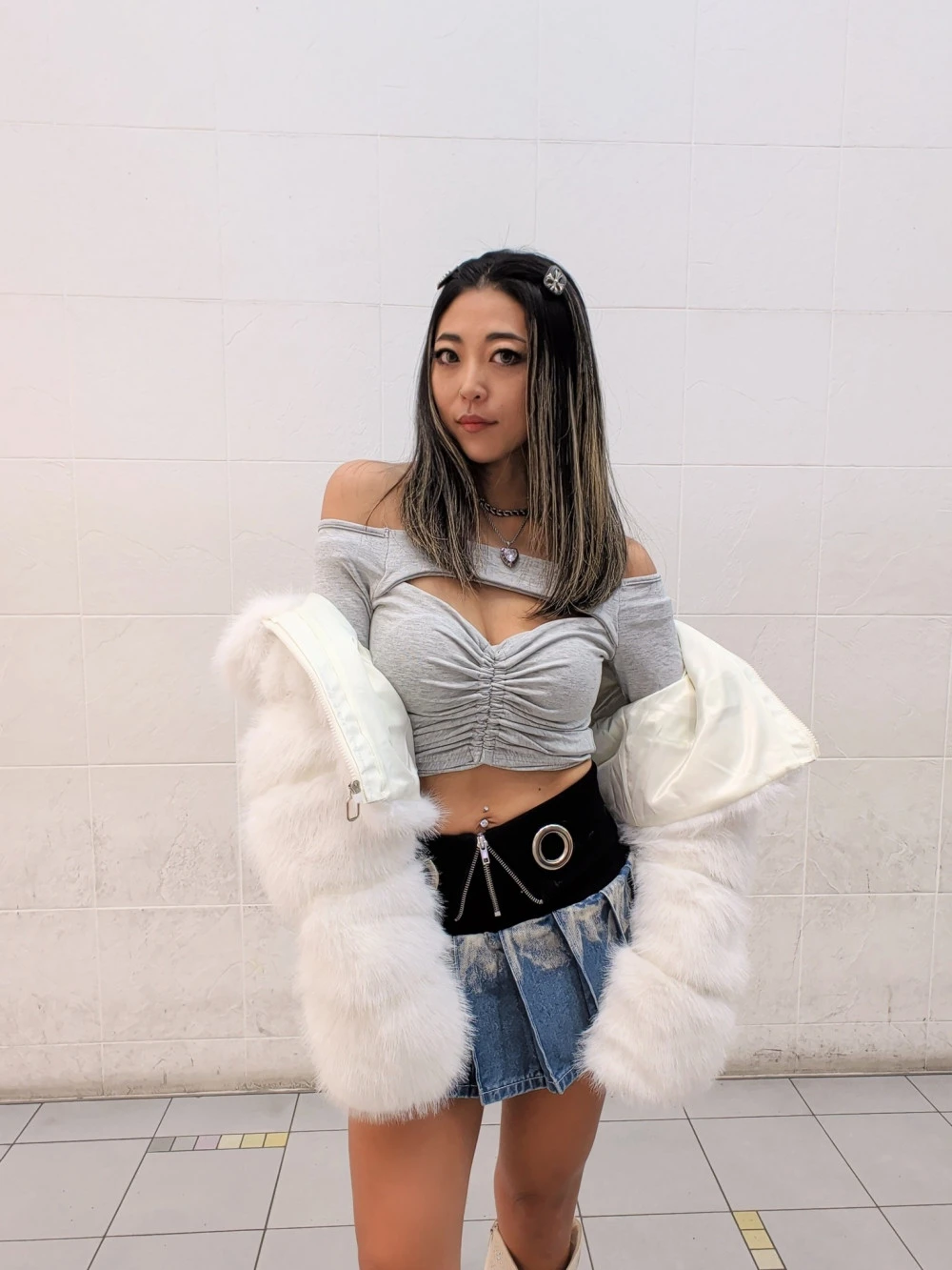 白のショート丈ファーコートはボリューム感が最高🩷トップスとボトムはタイトめを合わせるのが☝🏾💕