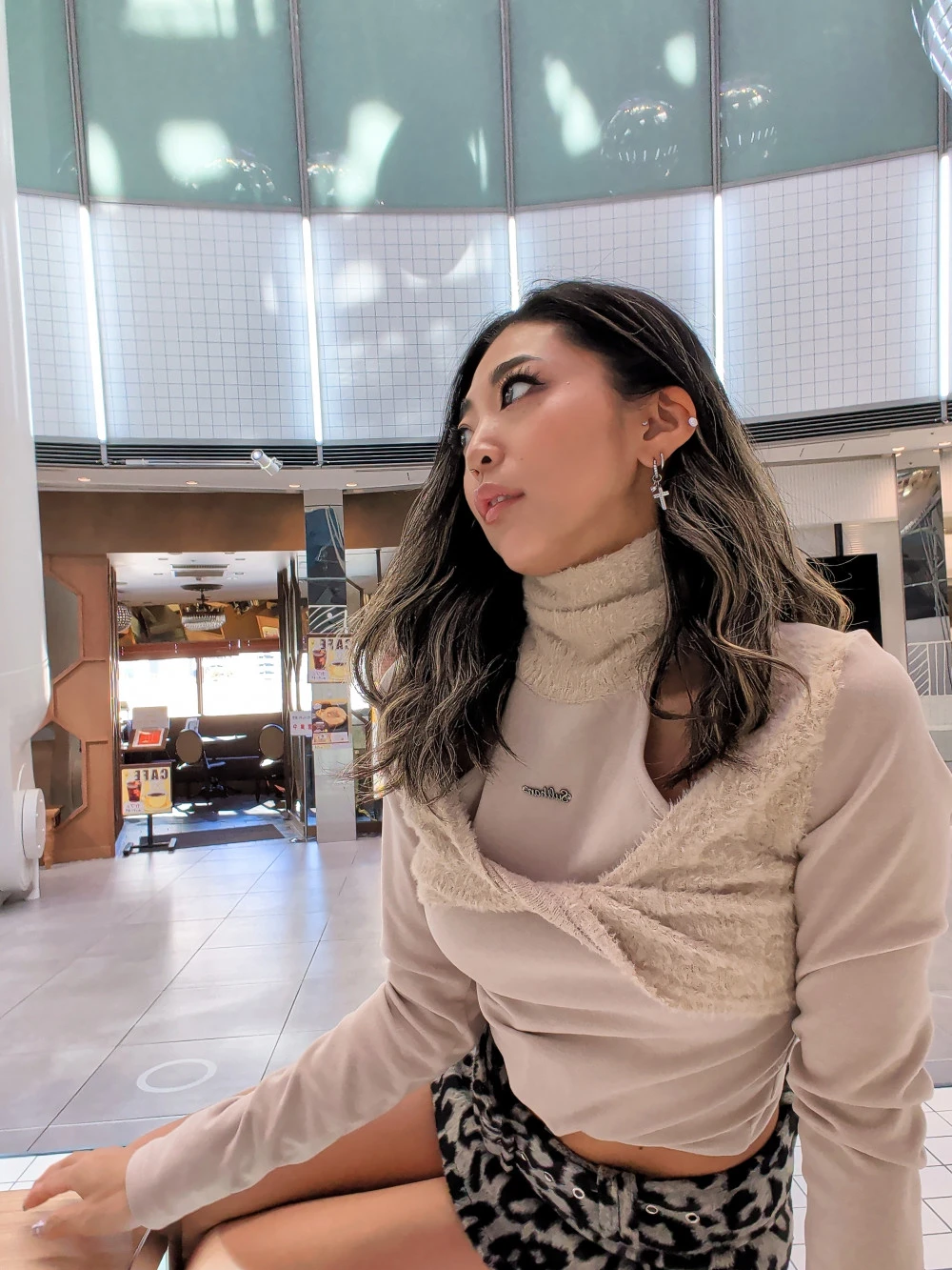 ベージュのタートルネックトップスは裏起毛素材でとっても暖かいのに細身シルエットでスタイルup確実💖💖