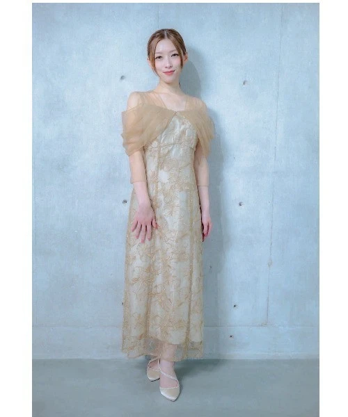セミAラインのシルエットと、身頃から腕にかけたチュールのドレープで、女性らしい印象に✨️