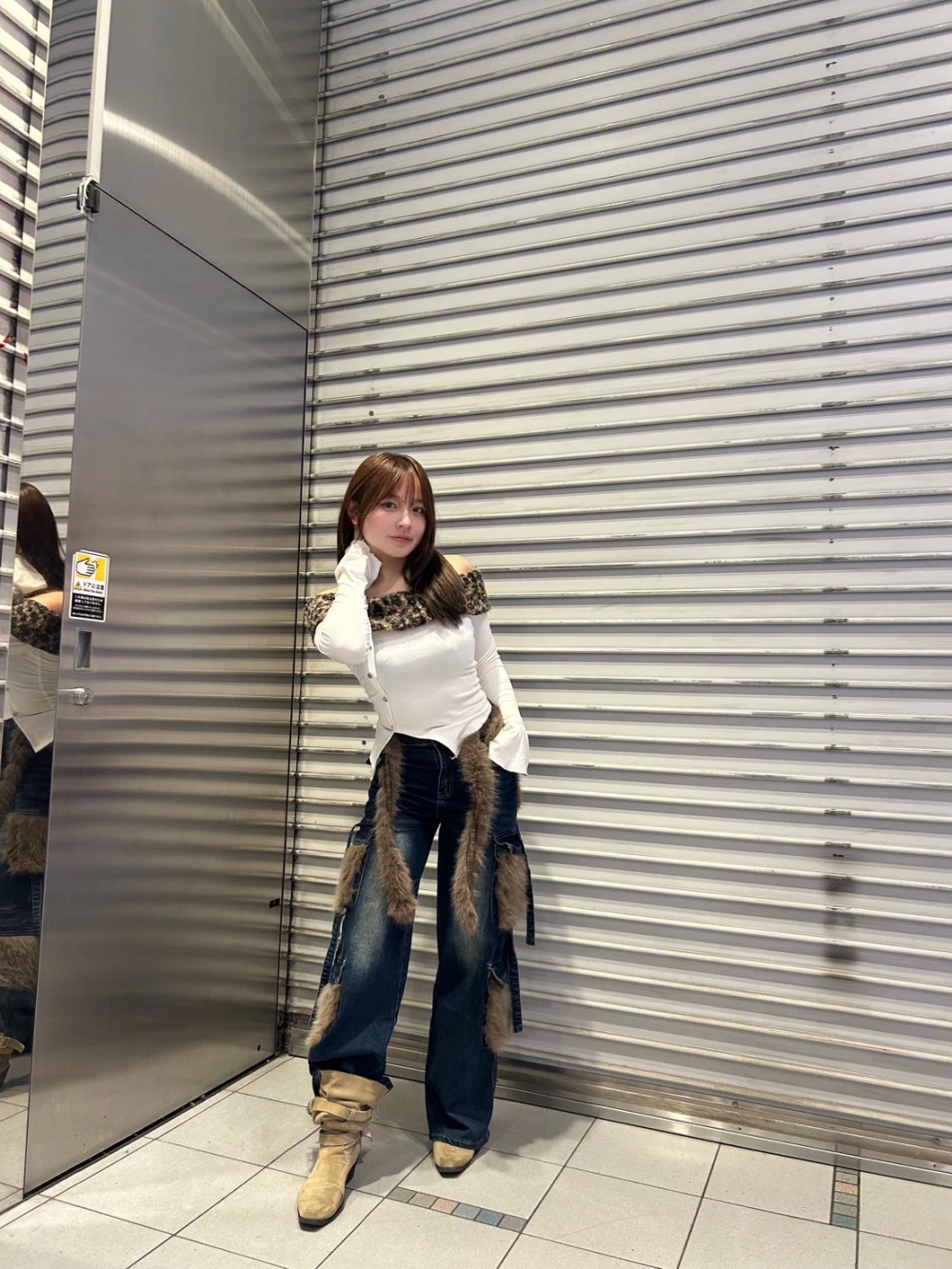 ファー付きデニムパンツはシンプルなトップスを合わせれば大人っぽく着こなせます🥰