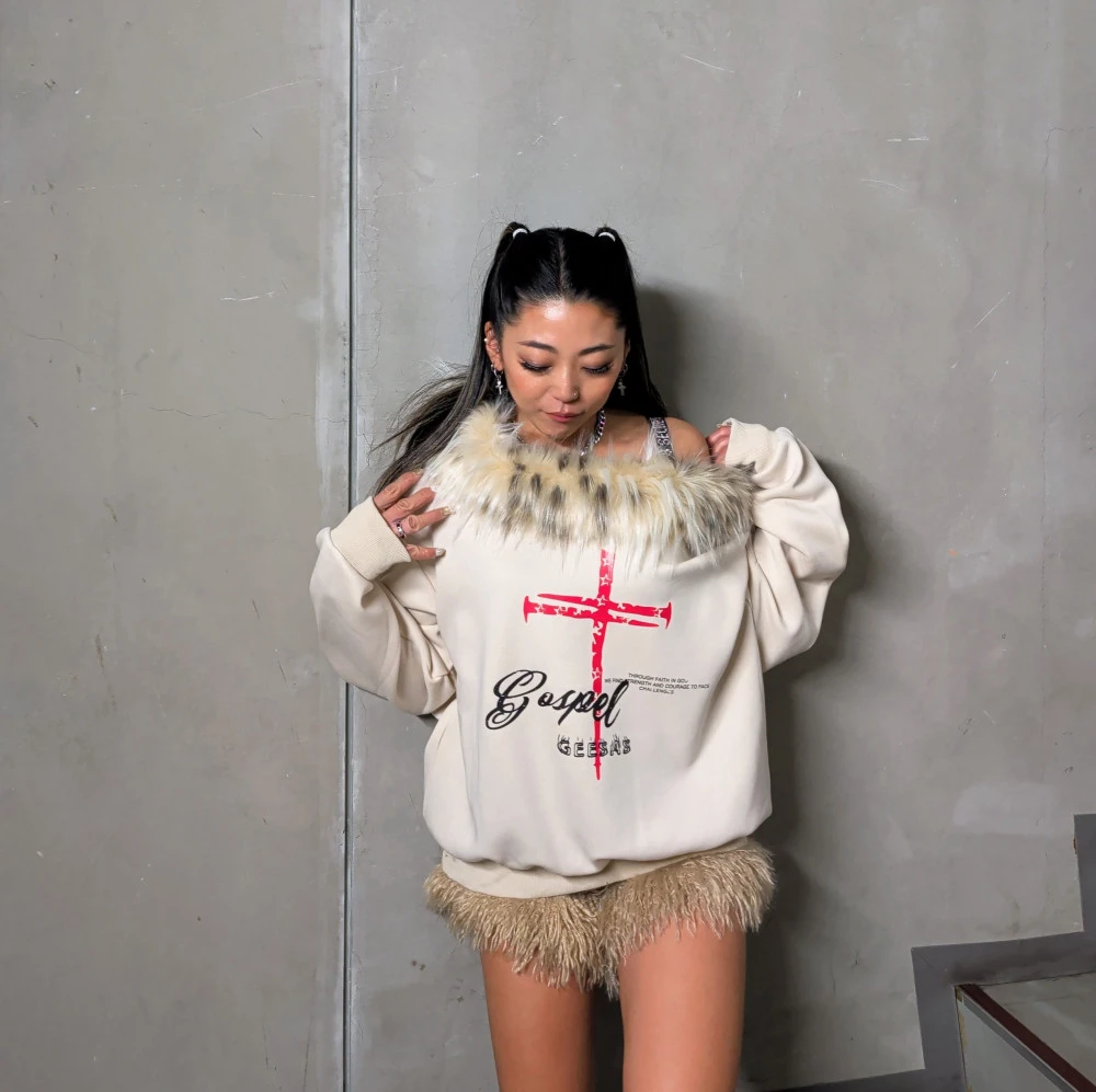 オフショルにアニマル柄のファーが付いたトレーナーら、デニムにもスカートにも合わせやすい👍🏾🩷
