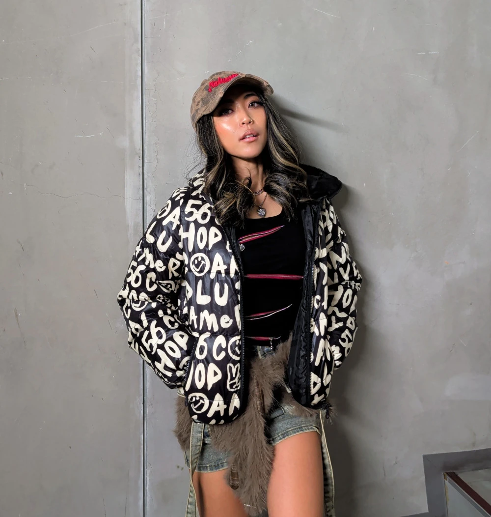ピタッとタイトめなトップスとスカートで合わせると、アウターのロゴが際立つコーデに⭐⭐