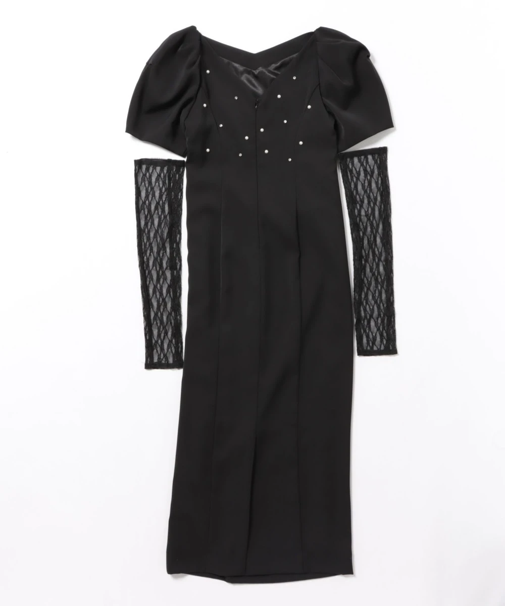 浅めのハートネックと立体的なボリュームスリーブが、シャープなシルエットを際立たせバックスタイルにはランダムに散りばめたビジュー&パールで印象的なアクセントをプラス❣️