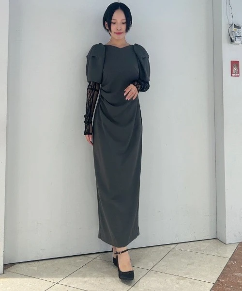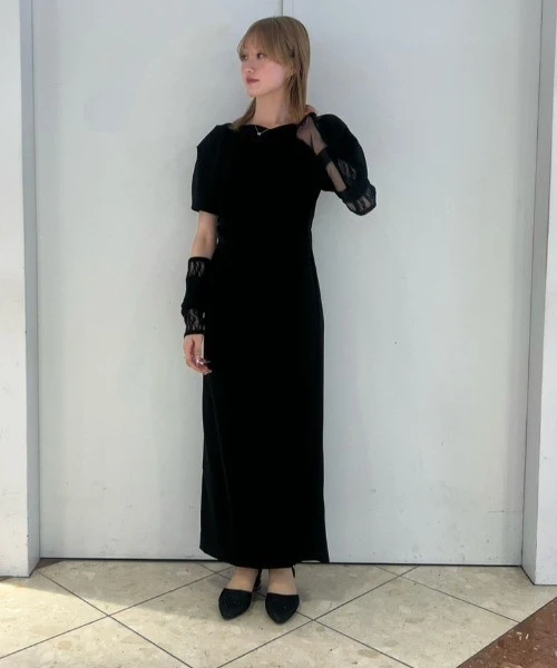 程よいとろみと落ち感のある素材で仕立てたワンピースに、レース×チュールのアームカバーをセット🥰