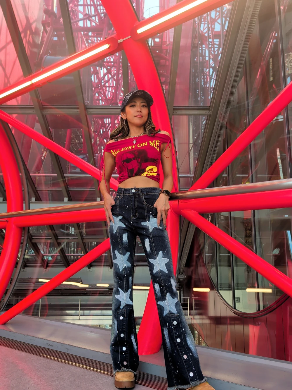 星のペイントと脚長効果抜群なハイウエストデニムには、タイトめオフショルトップスでスタイルup確実です🩷🩷