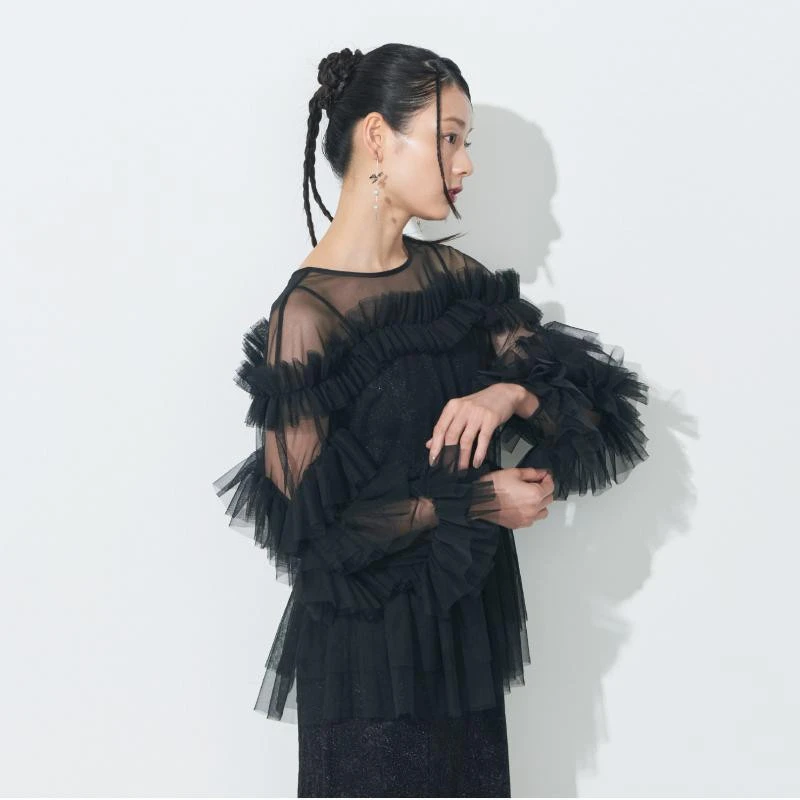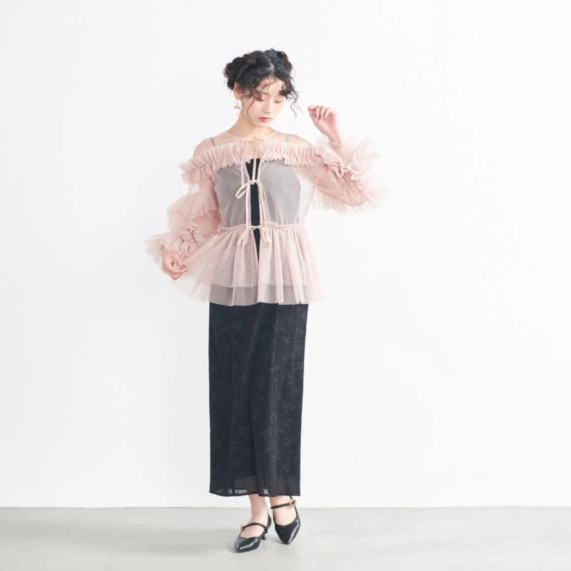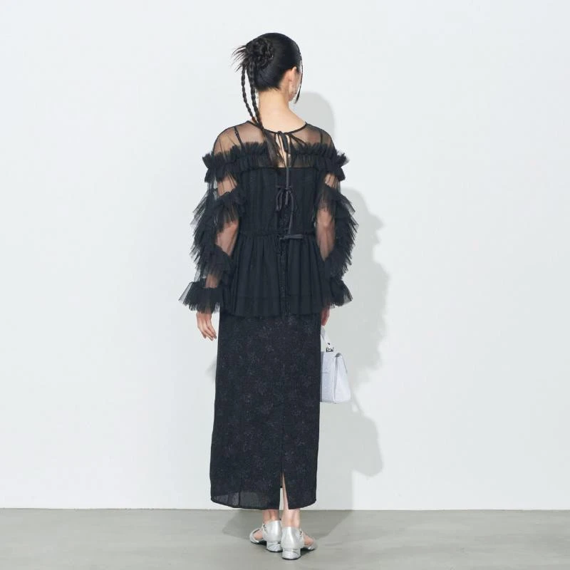 ブラウスは透け感のある柔らかなチュールに贅沢にあしらわれたフリルが、動くたびにふんわりと揺れ、華やかな存在感を放ちます🥰