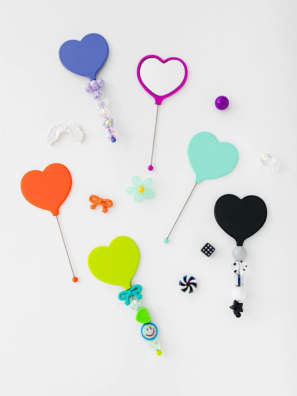 リボンやハートなど、ときめくモチーフパーツ、ベースのペンやミラーも種類豊富なので、組み合わせは自由自在。