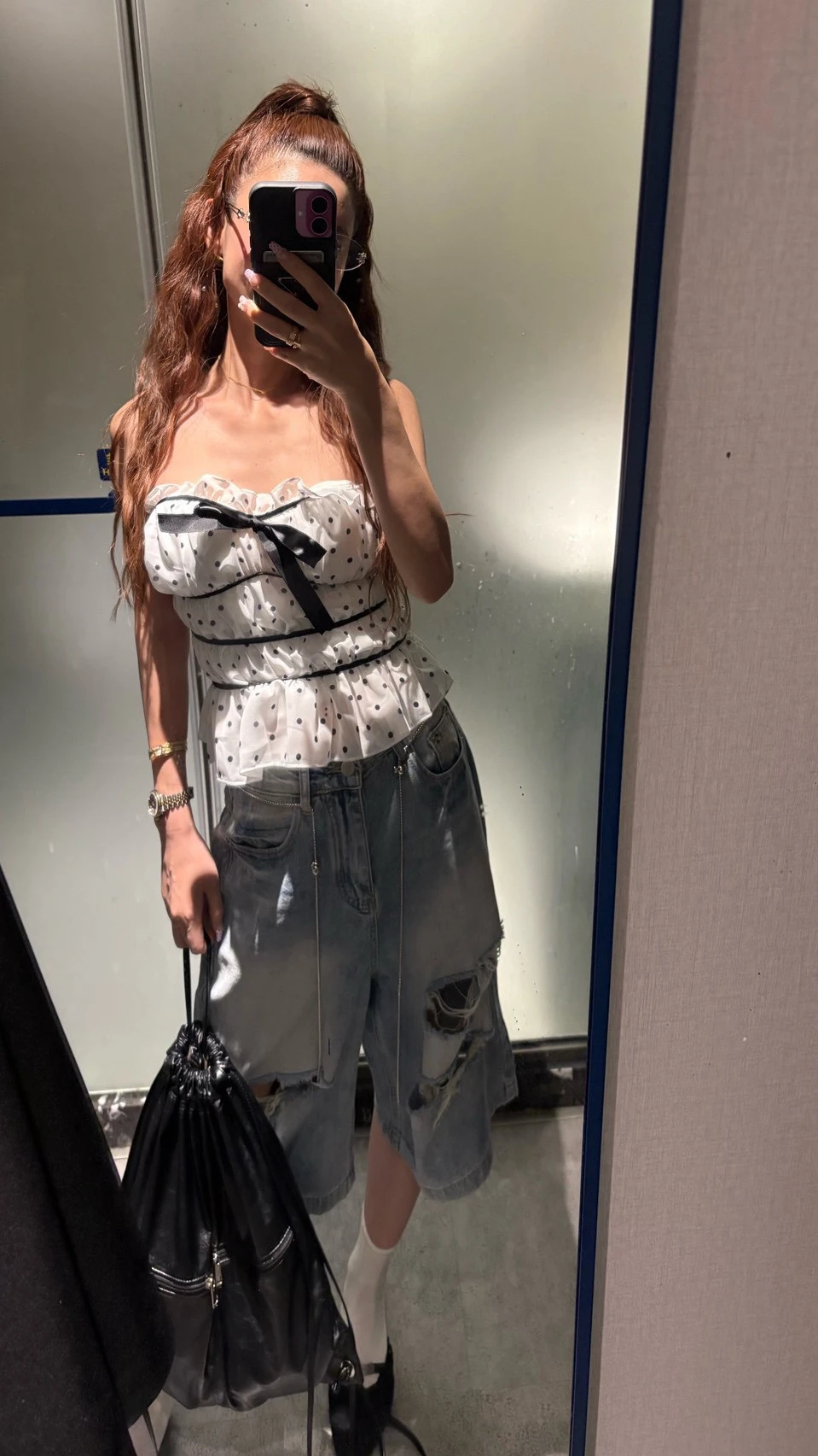 今季大人気のドットトップスをデニムハーフパンツでカジュアルダウンしたコーデ✨